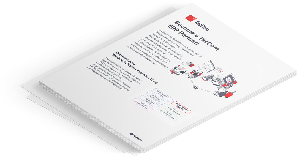 As part of the TecAlliance Partner Program, at TecCom we are launching a new partner concept for ERP providers and webshop providers. This is reflected in the expertise area “TecCom Solution Integrator”. With TecCom, the whole order-to-invoice process is covered digitally. Join our TecCom Partnership and widen the range of solutions you offer to your customers, strengthen the digitalization in the independent aftermarket.